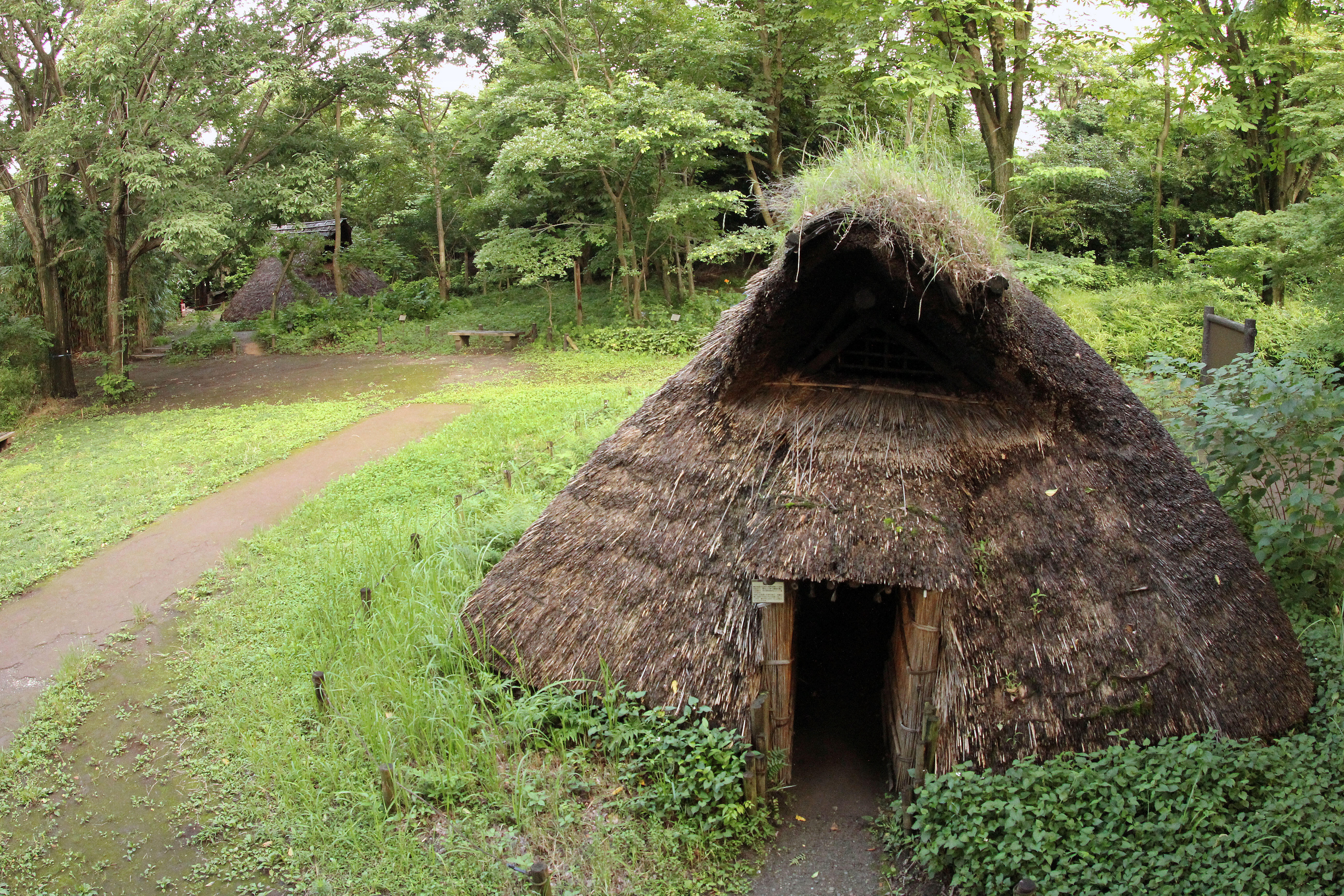 遺跡庭園「縄文の村」は縄文時代の集落跡等が見つかった多摩ニュータウンNo.57遺跡の上に作られました。 竪穴住居を3軒復元する他、縄文時代中期の植生を復元し、縄文時代の村の景観を再現しており、多摩ニュータウンにおける縄文時代集落の典型的な立地条件がわかりやすく理解できる場所でもあります。